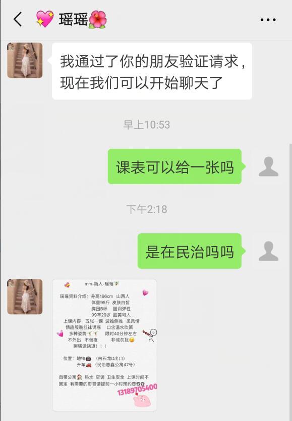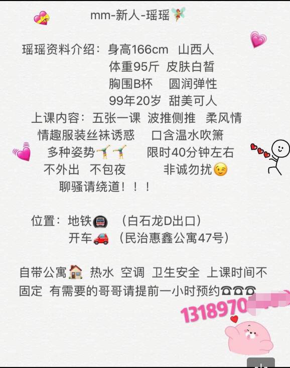 以上信息为网友分享,请在消费时自行判断谨慎消费。出现虚假信息和诈骗信息请站内短信给艾欧利雅:方法一:点击给艾欧利雅发短信——方法二:点击给艾欧利雅发短信 为了鼓励会员积极回复验证,现只要购买了主题的会员回复验证体验都奖励10--20金币。带偷拍图片验证的,奖励40---50金币 【寻欢地址】: 【妹子网名】:瑶瑶 【服务项目】: 【小姐外形】:80 【价格一览】:500 【联系方式】: