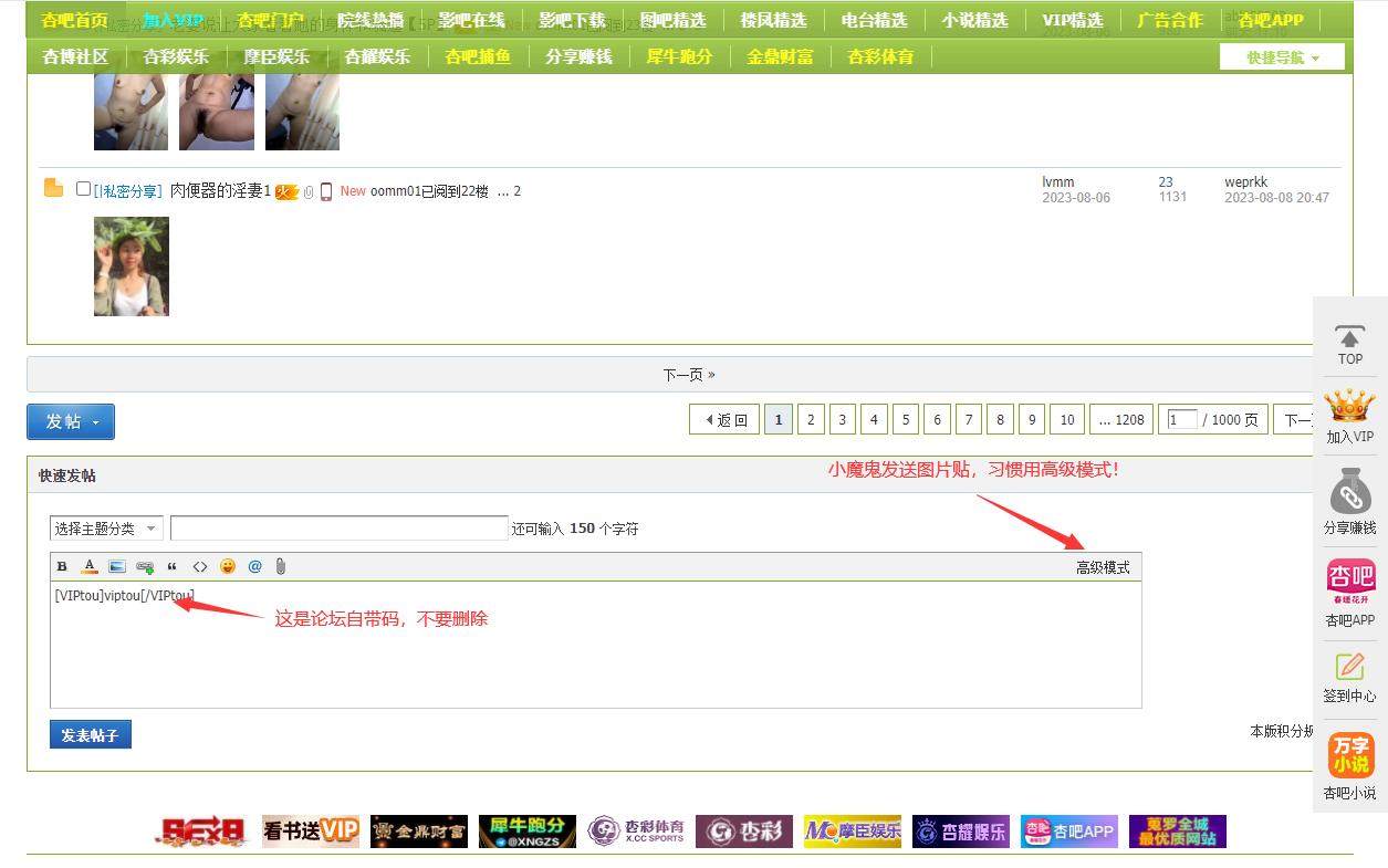 1、本版发布内容必须遵从【杏吧Sex8】总版规第五条要求。 2、本版可讨论与杏吧有关的内容,但不作为意见处理区之用,版主有权不解答会员问题,或将主题转移至相关版块。 3、本版可讨论与杏吧无关的内容,但不得讨论杏吧以外的其他网站,否则视为广告宣传给予处理。 4、本版可讨论与性福无关的内容,同样不得涉及网站,严禁违规内容:如政治、SHOU交、YOU交等行为。 5、会员交流时不得公开个人信息,如住址、电话、职业、QQ等通信信息。 6、为防止恶意放毒挂马,任何形式的链接和附件都将受到版主监督。 7、不得发布任何形式的隐藏帖、购买帖。