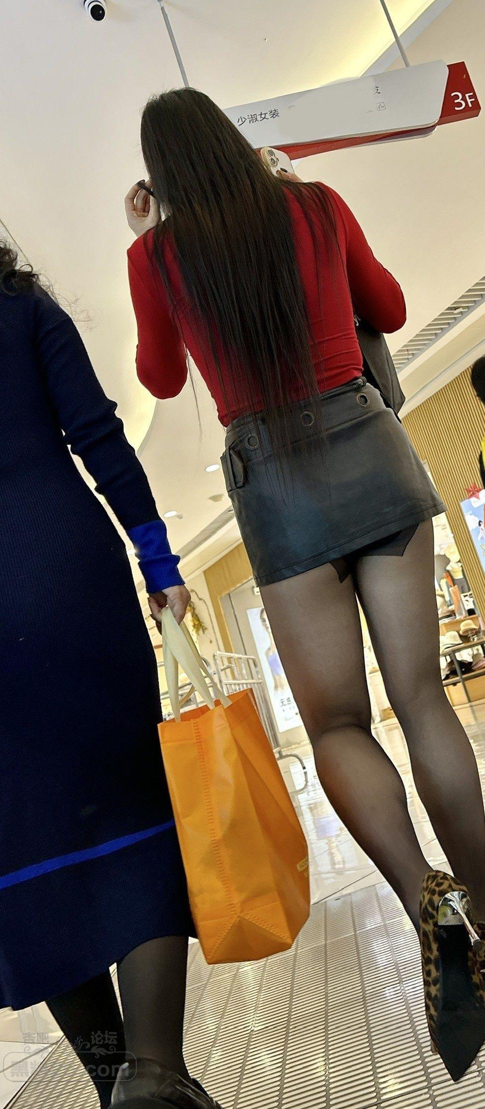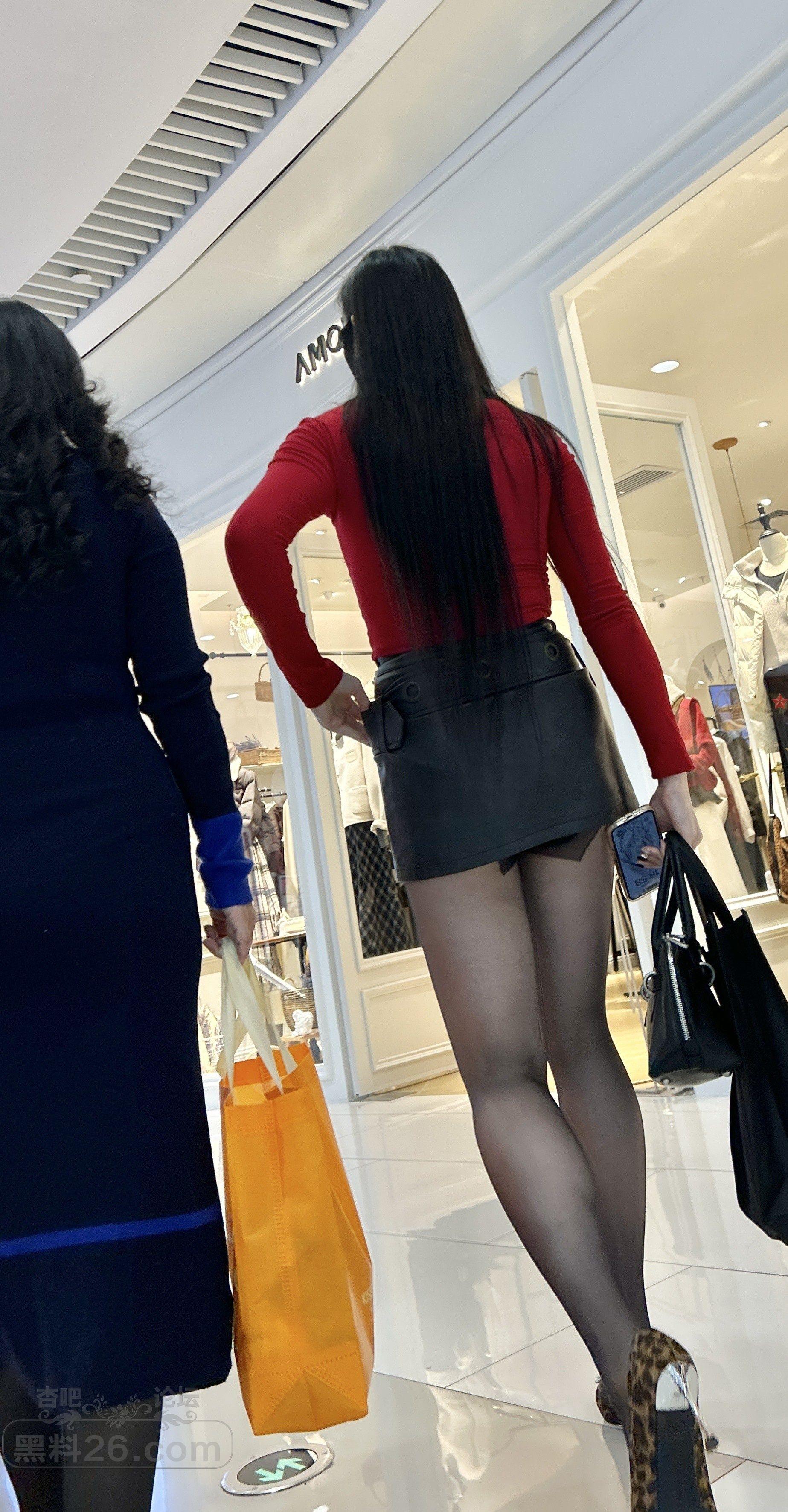 红色上衣黑色皮裙长发美女黑丝美腿商场里亮眼【10P】